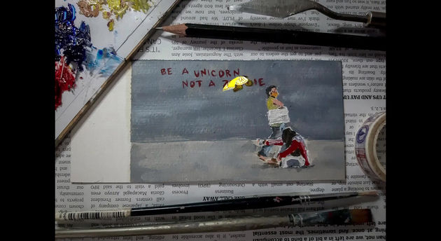 “Ordinary Day” is a stop motion film using rough brushstrokes of oil paint upon canvas paper. It depicts a plain wall mural saying, ‘Be a Unicorn, not a Zombie’; where a common scene of people passing by and a poor beggar asking for alms. As seen in the film, bystanders continuously walk past the still beggar as if her presence were non-existent or invisible. However, despite being ignored, the beggar remains at her place waiting for a simple act of kindness, hope, and change as symbolized by the yellow butterfly which also seems invisible.